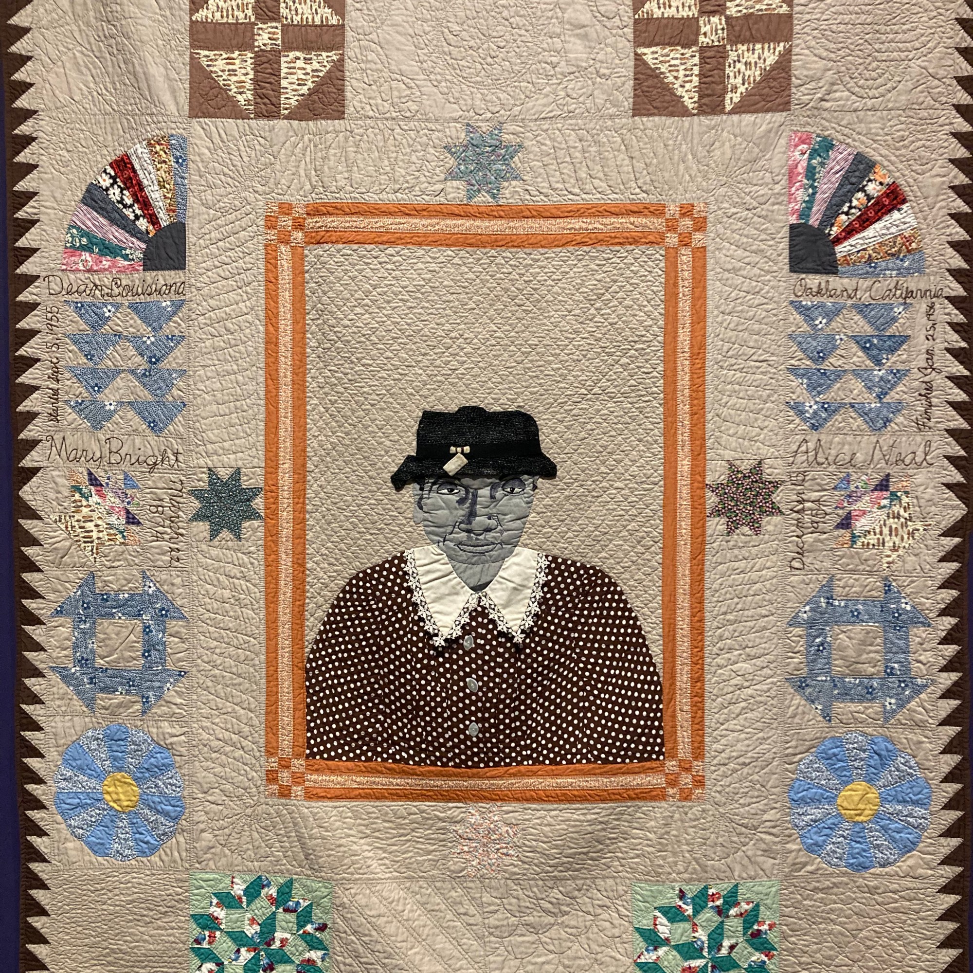 The quilt highlighted above, with the portrait of the woman in the center was started by Alice Neal a few days after her mother, Mary Bright–also a quilter–passed away. She painted the image from a photograph of her mother, and used cloth from the dress her mother was wearing in the photograph to recreate the dress in the quilt. When she finished it a year later, she hoped to hang the quilt in a museum that she had planned to build on her family’s land in Louisiana. But when the land was bought by a television station (the text panel on the exhibit wall didn’t talk about the circumstances of the sale), she it to the prominent Bay Area quilt collector Eli Leon, because she knew he would be able to best preserve and share the quilt’s story. The fact that Ms. Neal memorialized her mother in this way, using the art form that her mother taught her; the fact that she wanted to tell her mother’s story; the fact that she was planning to open a museum; and the fact that sought out the one person who she thought could best ensure that her mother’s story gets told are all stunning examples of us knowing the value of our lives and stories. Those acts of remembrance and narrative agency are so powerful.